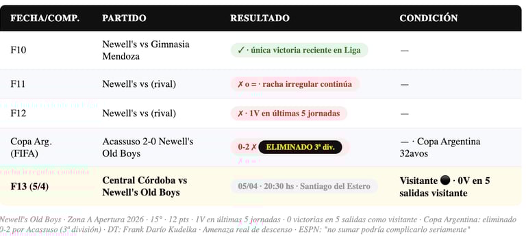 📊 Newell's Old Boys — F13: 15° Zona A · 12 pts · 1V en últimas 5 · 0V como visitante
