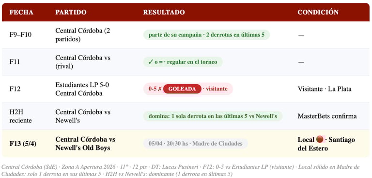Central Córdoba de Santiago del Estero llega al partido con el sabor amargo de la goleada 0-5 ante Estudiantes de La Plata que lo dejó en el 11° lugar con 12 puntos. Pero MasterBets señala que el equipo de Lucas Pusineri tiene "solo dos derrotas en sus últimos cinco encuentros" — lo que indica que la goleada fue una excepción. Como local en el Estadio Único Madre de Ciudades, el equipo santiagueño tiene un registro positivo: "solo han perdido uno de sus cinco actuaciones previas" en casa. La cancha de Santiago del Estero, a más de 300 km de Buenos Aires, es un escenario poco habitual para los visitantes porteños y rosarinos.