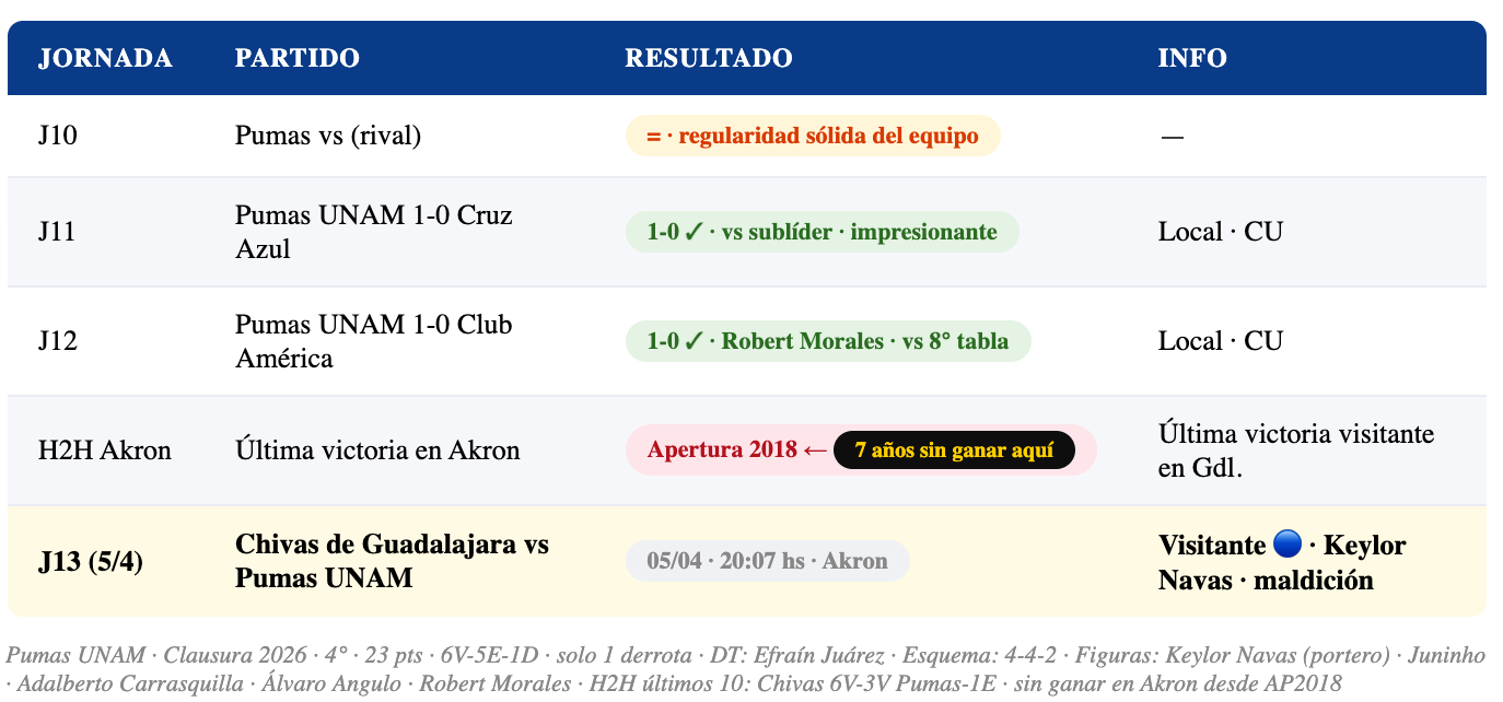Pumas UNAM de Efraín Juárez llega al Akron en su mejor momento del torneo. Tras vencer a Cruz Azul y al Club América consecutivamente, el equipo auriazul se consolidó en el 4° lugar con 23 puntos y solo 1 derrota en todo el Clausura 2026. La figura es Keylor Navas — el portero costarricense multiganador de Champions League con el Real Madrid — que se convirtió en el referente y líder del vestidor universitario. Atacantes peligrosos: Juninho y Robert Morales (gol ante América). El problema es histórico: Pumas no gana en el Estadio Akron como visitante desde el Apertura 2018 — más de 7 años sin triunfo en Guadalajara.
