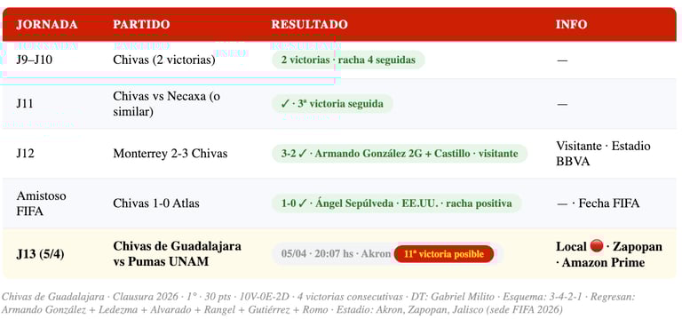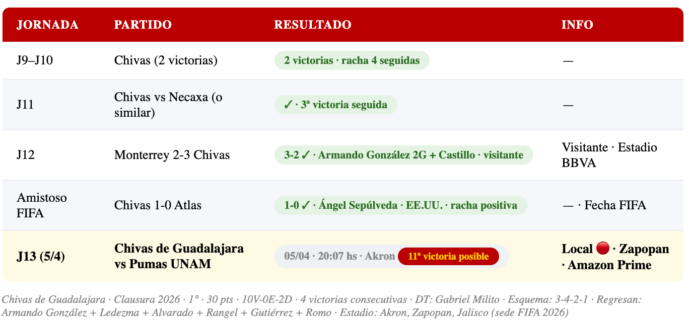 Chivas de Guadalajara vive su mejor momento en años. El sistema 3-4-2-1 de Gabriel Milito ha generado un equipo compacto y letal — 10 victorias y 2 derrotas, sin ningún empate en el torneo. Una estadística absolutamente extraordinaria. La última victoria fue 3-2 ante Monterrey con goles de Armando González (doblete) y José Castillo. El "Rebaño" también ganó el amistoso ante Atlas 1-0 durante la Fecha FIFA con gol de Ángel Sepúlveda, lo que habla del estado mental del plantel. El Akron es una fortaleza — y Pumas no gana ahí desde el Apertura 2018.