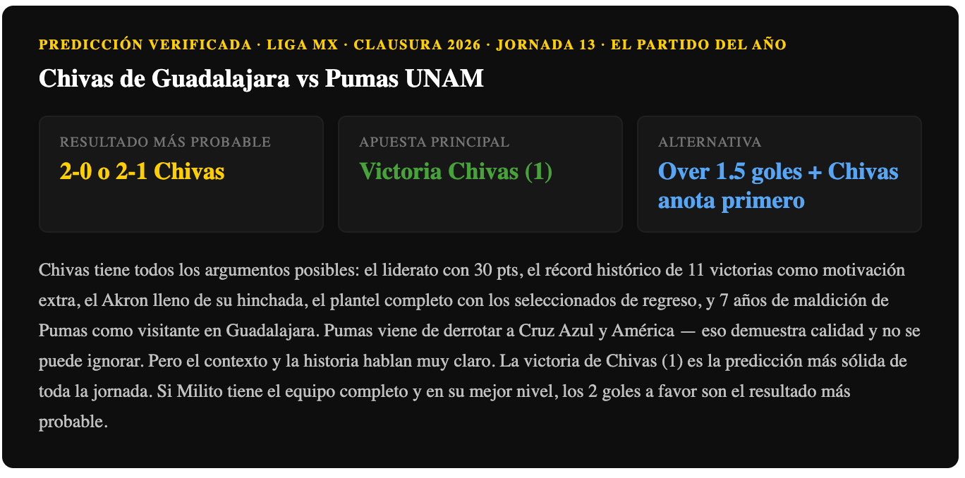 Pronóstico Chivas vs Pumas — Jornada 13 Clausura 2026 Liga MX