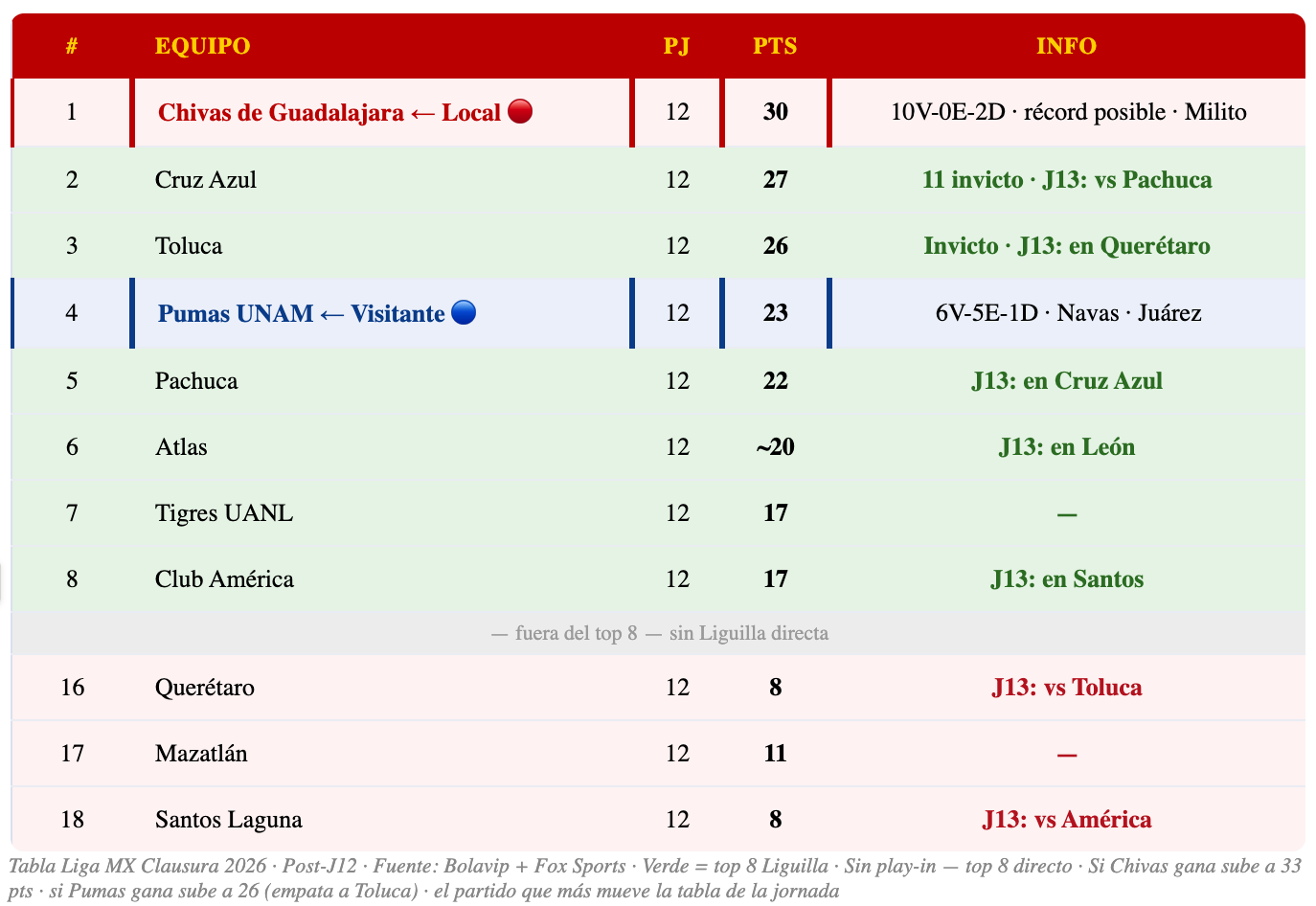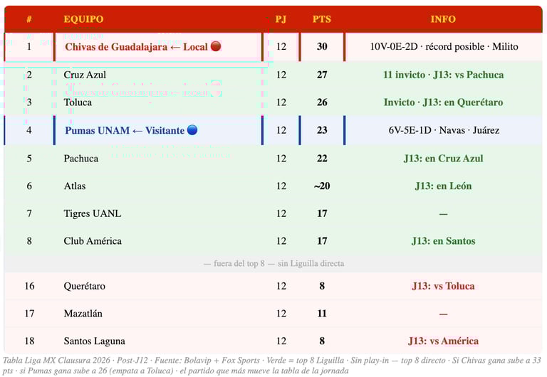 📊 Chivas — J13: 1° · 30 pts · 10V-0E-2D · a 3 del siguiente (Cruz Azul, 27 pts)