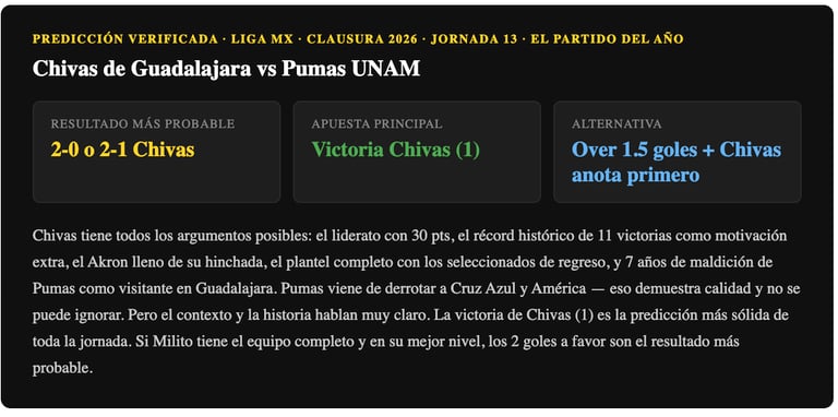 Chivas es el favorito absoluto — líder del torneo, 10 victorias, el récord histórico como motivación extra, el Akron como fortaleza y Pumas sin ganar ahí desde 2018. Pumas viene de vencer a Cruz Azul y América, lo que demuestra calidad, pero el contexto habla demasiado claro. Victoria Chivas (1) con over 1.5 goles es la predicción más respaldada de toda la jornada.