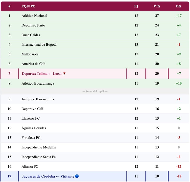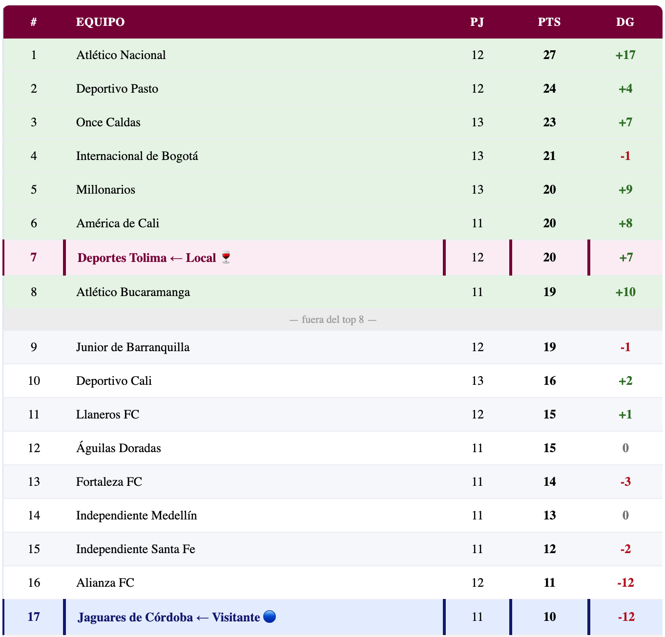 Tolima (7°, 20 pts) está bien posicionado en el top 8. Una victoria este sábado lo consolida y le da ventaja ante los rivales que lo siguen. Jaguares (17°, 10 pts) está en zona de descenso y necesita sumar con urgencia para no quedar definitivamente sentenciado.