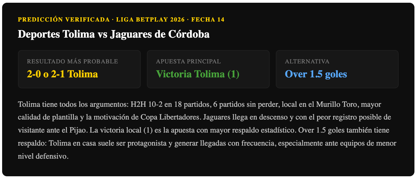 Pronóstico Deportes Tolima vs Jaguares de Córdoba — Fecha 14 Liga BetPlay 2026