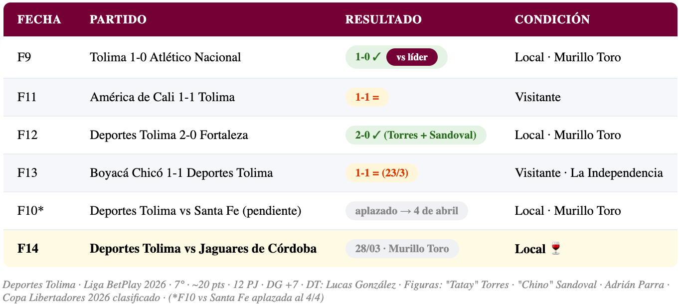 📋 PARTIDO PENDIENTE F10: Tolima tiene aplazado su partido de la Fecha 10 ante Independiente Santa Fe, reprogramado para el 4 de abril. Si gana ese partido pendiente, puede escalar posiciones significativamente en la tabla.
