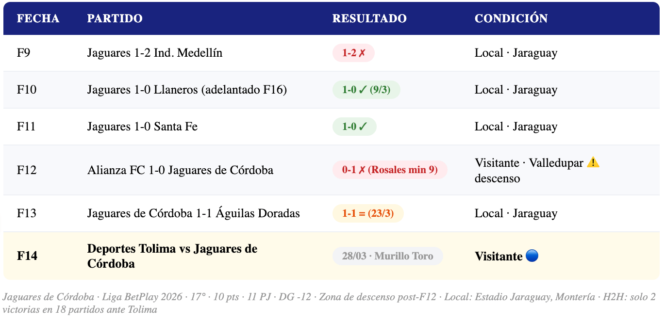 La Fecha 12 fue un golpe brutal para Jaguares de Córdoba. La derrota 1-0 ante Alianza en Valledupar — gol de Yilson Rosales en el minuto 9 — los mandó directamente a la zona de descenso, según el análisis de El Tiempo. El equipo de Montería llega al Manuel Murillo Toro con apenas 10 puntos en 11 partidos y la urgencia de sumar para no quedar definitivamente comprometido.