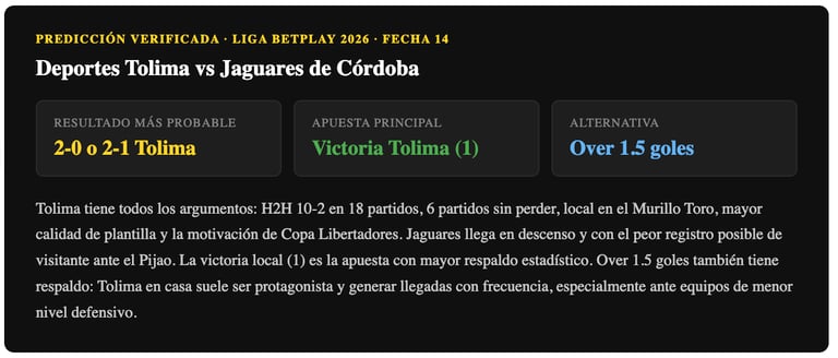 Si Tolima abre el marcador en los primeros 30 minutos, el resultado está decidido. Si Jaguares aguanta el primer tiempo sin recibir, podría intentar algo en el segundo. Pero el nivel de Tolima y la presión del Murillo Toro hacen que esa opción sea estadísticamente poco probable.