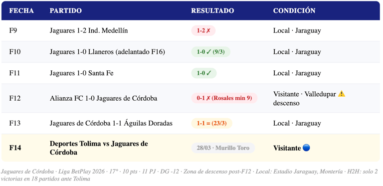 📊 Jaguares de Córdoba — Fecha 14: 17° · 10 pts · 11 PJ · DG -12 · zona de descenso