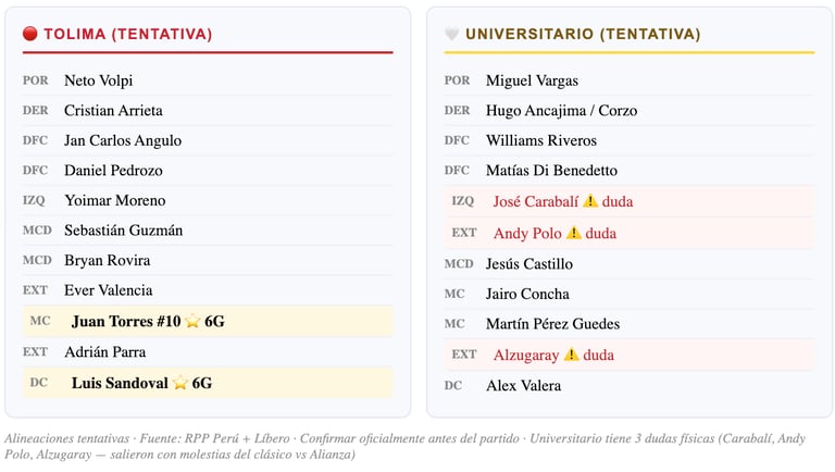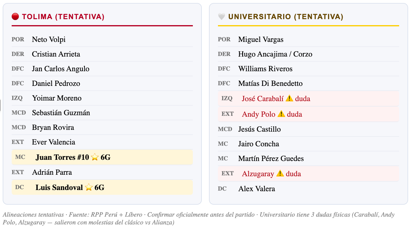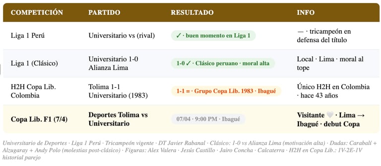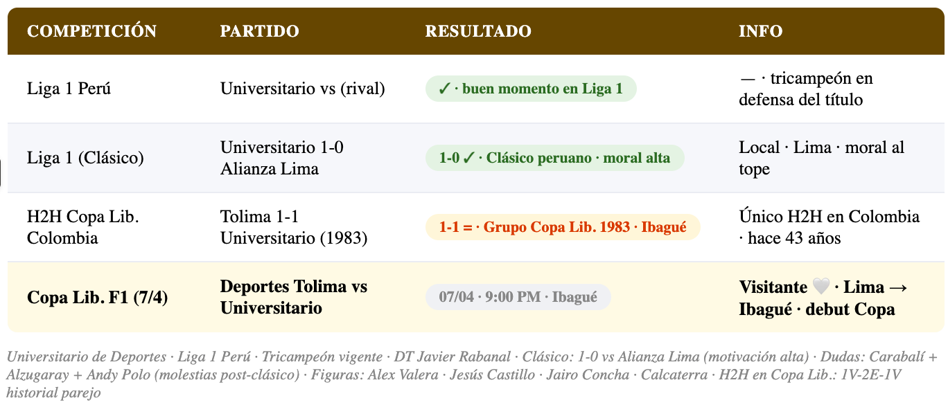 Universitario de Deportes llega a Ibagué con la moral alta tras ganar el último clásico del fútbol peruano ante Alianza Lima. El club "Crema" de Lima es el vigente tricampeón de la Liga 1 peruana y tiene años de experiencia en Copa Libertadores. Sin embargo, el DT Javier Rabanal ha generado debate táctico y hay dudas sobre la disponibilidad de varios jugadores que salieron con molestias del clásico: José Carabalí, Lisandro Alzugaray y Andy Polo. La altura de Ibagué (1.285 msnm) no es un factor tan determinante como Bogotá o ciudades andinas, pero el viaje y el cambio de condiciones siempre pesa.