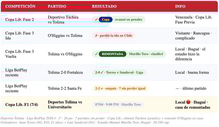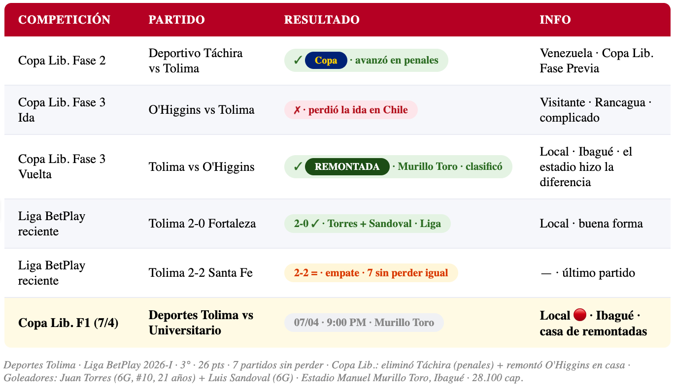 🏟️ MURILLO TORO COMO FORTALEZA: Tolima llegó a esta fase de grupos precisamente gracias al Estadio Manuel Murillo Toro. En la fase previa, el equipo iba perdiendo ante O'Higgins de Chile, pero remontó en casa para avanzar — y antes, eliminó a Deportivo Táchira en penales. Ibagué es una plaza temible en el fútbol sudamericano.