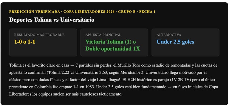 Pronóstico Deportes Tolima vs Universitario — Copa Libertadores 2026