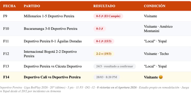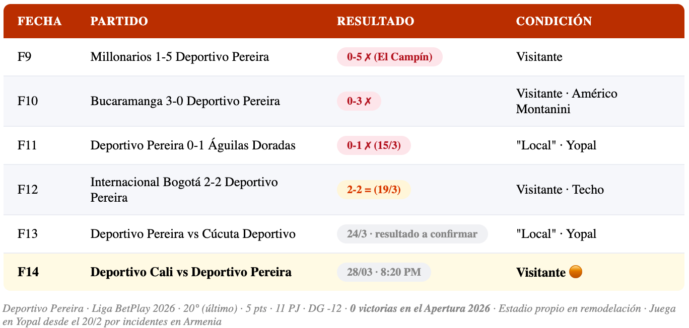 El contexto de Deportivo Pereira en este torneo tiene un trasfondo doloroso. Después de los violentos incidentes del 20 de febrero en Armenia — enfrentamientos entre hinchas de Pereira y Quindío que dejaron un fallecido — la administración local canceló el acuerdo de uso del estadio Centenario. El equipo tuvo que trasladarse a Yopal, un escenario a más de 8 horas de distancia de Pereira, convirtiendo cada "partido de local" en una expedición logística. Ese contexto explica en parte el desempeño irregular del equipo en condición de local durante el segundo tramo del torneo.