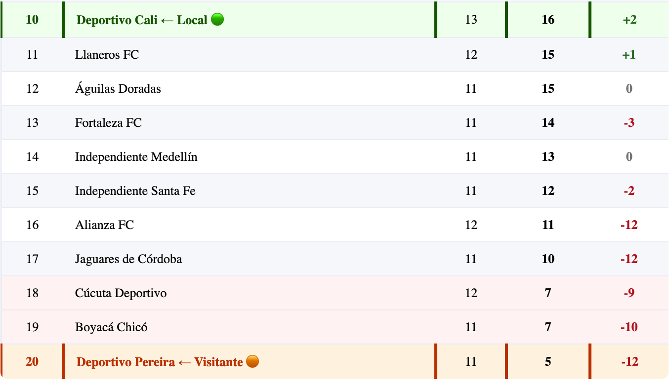 📊 Deportivo Cali — Fecha 14: 10° · 16 pts · 13 PJ · DG +2 · fuera del top 8