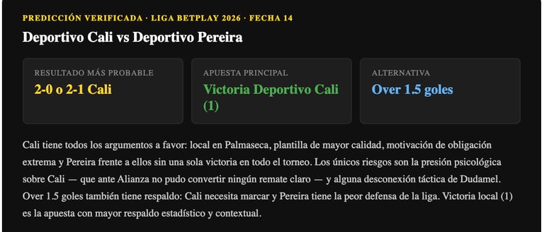 Cali es amplio favorito: mejor plantilla, local en Palmaseca, motivación de necesidad extrema, y enfrente el peor equipo de la tabla sin una sola victoria en el torneo. La victoria local (1) es el resultado con mayor respaldo. Over 1.5 goles también tiene sentido — Cali necesita goles para diferencia de gol y Pereira no tiene la solidez defensiva para aguantar. El único riesgo real es la presión: si Cali empieza a fallar en las primeras llegadas, el partido se puede poner nervioso.
