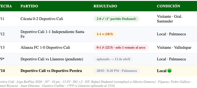 Deportivo Cali vive una temporada de altibajos. El cambio de Alberto Gamero a Rafael Dudamel a mitad del torneo generó expectativas, pero los resultados no han acompañado del todo. Con Dudamel, el balance es desigual: victoria contundente 2-0 vs Cúcuta pero derrota dolorosa 0-1 ante Alianza de visitante. Antes de su llegada, el equipo ya mostraba irregularidad — empates ante Santa Fe y Bucaramanga que no le alcanzaban para consolidarse en los primeros puestos.