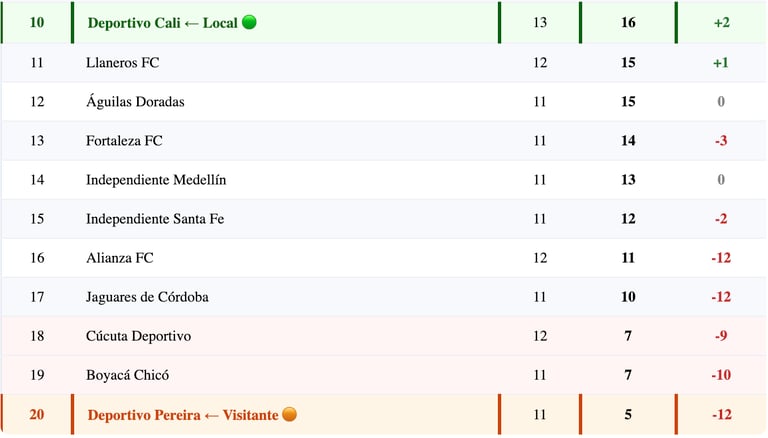 🚨 PRESIÓN MÁXIMA PARA CALI: Después de perder 1-0 con Alianza FC en la Fecha 13 (gol de Fabián Cantillo, minuto 39), Deportivo Cali quedó en la 10ª posición con 16 puntos en 13 PJ. El puesto 8 tiene 19 pts. Con solo 6 fechas restantes más un partido pendiente vs Llaneros (12 de abril), Cali necesita ganar urgentemente. Una derrota o empate ante Pereira comprometería seriamente sus opciones matemáticas.