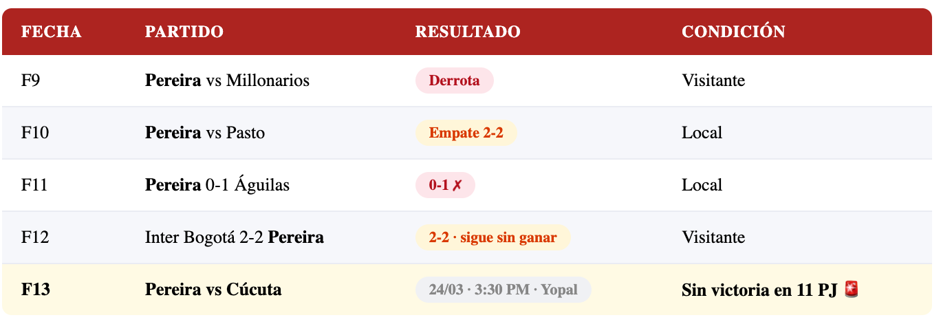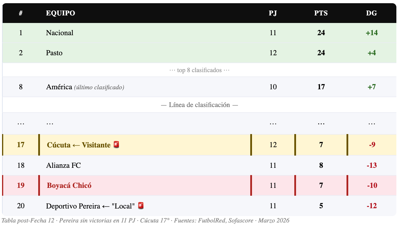 Los números son brutales. Pereira tiene 5 puntos en 11 partidos — solo empates, ninguna victoria, muchas derrotas. Es el último de la tabla y el equipo con peor rendimiento del torneo 2026-I. Cúcuta tiene 7 puntos en 12 partidos, 17° de 20 equipos, también en zona de descenso. Los dos equipos llevan todo el torneo sin poder despegarse del fondo de la tabla.