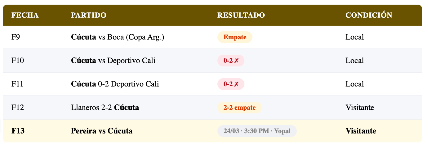 El ascendido norteño sabe que hoy tiene una oportunidad de oro para sumar tres puntos ante un rival directo en la batalla por la permanencia. Si Cúcuta gana, amplía la diferencia sobre Pereira a 5 puntos y agrava la situación del equipo risaraldense.