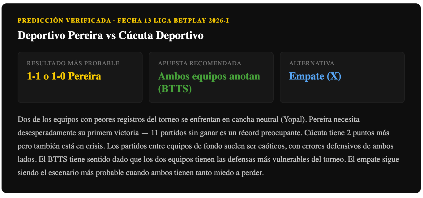 Con dos equipos en crisis absoluta, la lógica del fútbol en partidos así es que los errores y el nerviosismo dominan sobre la táctica. El empate es muy probable dado el contexto. Sin embargo, la urgencia mayor de Pereira — que necesita su primera victoria del torneo sí o sí — puede generar una salida más agresiva que beneficie a Cúcuta si el local (en este caso Pereira como equipo "anfitrión" oficial) comete errores.
