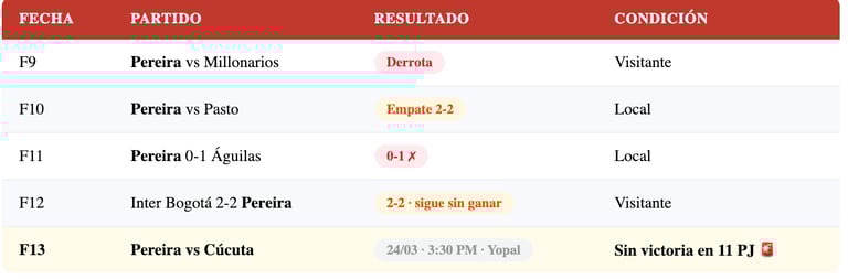 El "Matecaña" atraviesa su peor temporada reciente. Con 5 puntos en 11 partidos — todos provenientes de empates — el equipo de Pereira no ha ganado un solo partido en el Apertura 2026. En la Fecha 12 empató 2-2 ante Inter Bogotá de visitante, resultado que les arrancó un punto pero que no mejora la situación real del equipo. En la Fecha 11, perdió 0-1 ante Águilas Doradas en casa — una de las derrotas más dolorosas de la temporada por la urgencia del momento.