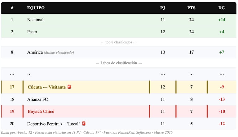 📊 Cúcuta Deportivo — Liga BetPlay 2026-I (12 PJ): 7 puntos · 17° lugar · DG -9