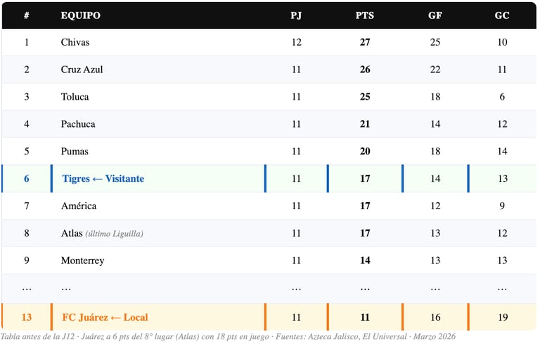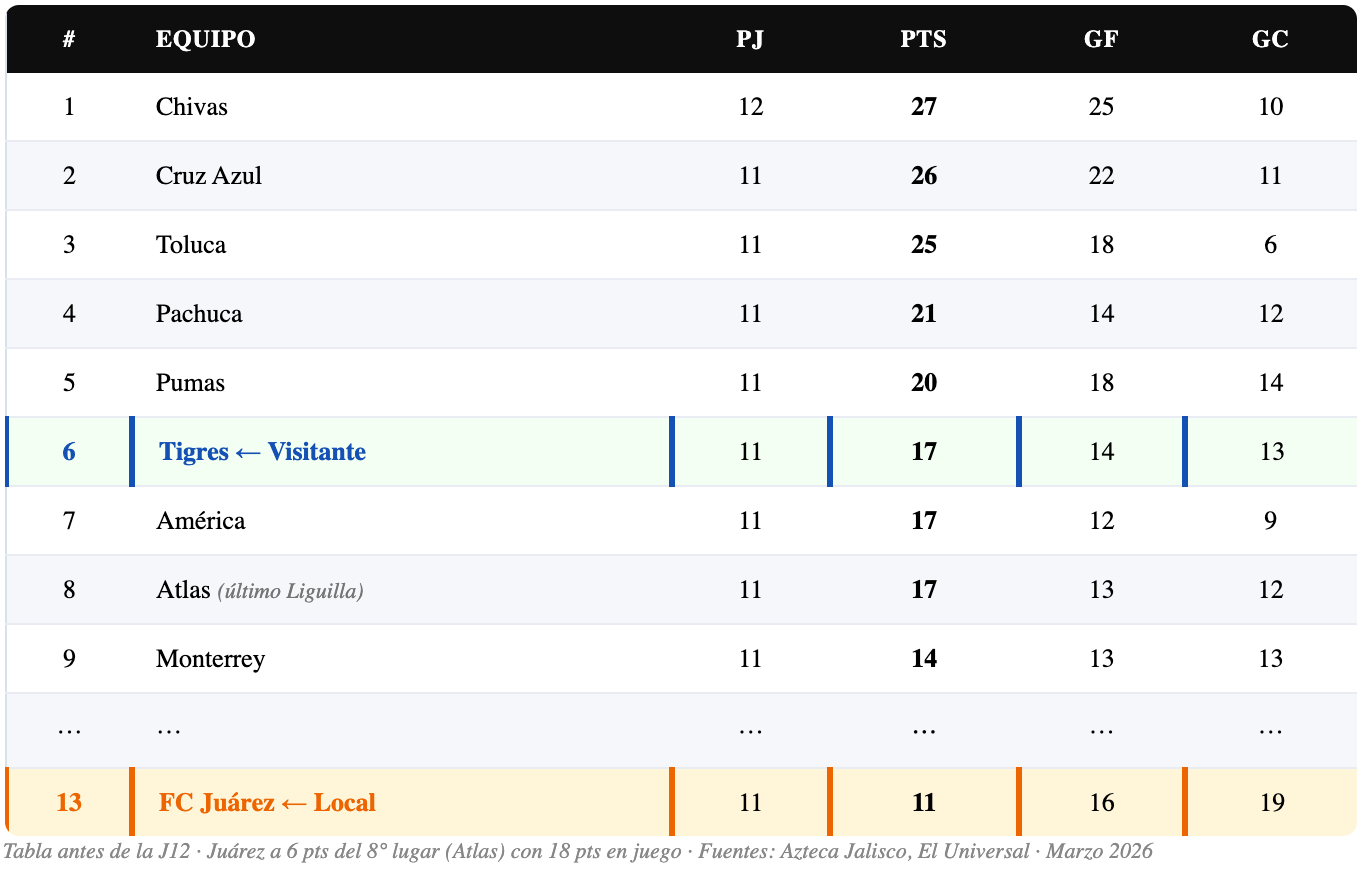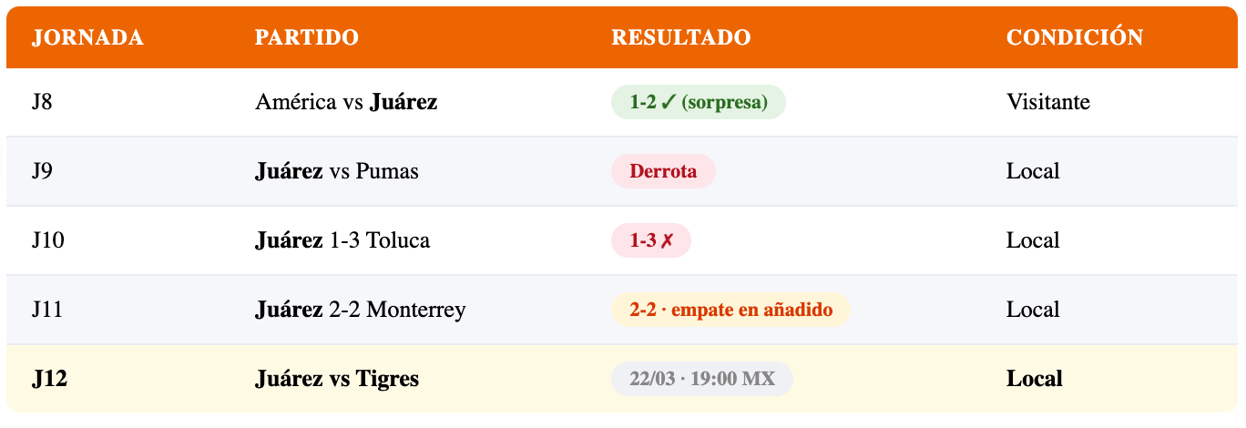 Este choque llega en un momento de máxima tensión para ambos equipos. Juárez está 13° con 11 puntos, a 6 de la zona de Liguilla. Una derrota hoy prácticamente los elimina. Tigres está 6° con 17 puntos, en zona de clasificación, pero su peor partido del torneo — el empate 0-0 ante Querétaro en J11 — mostró que no son infalibles, especialmente cuando no están al cien por ciento.