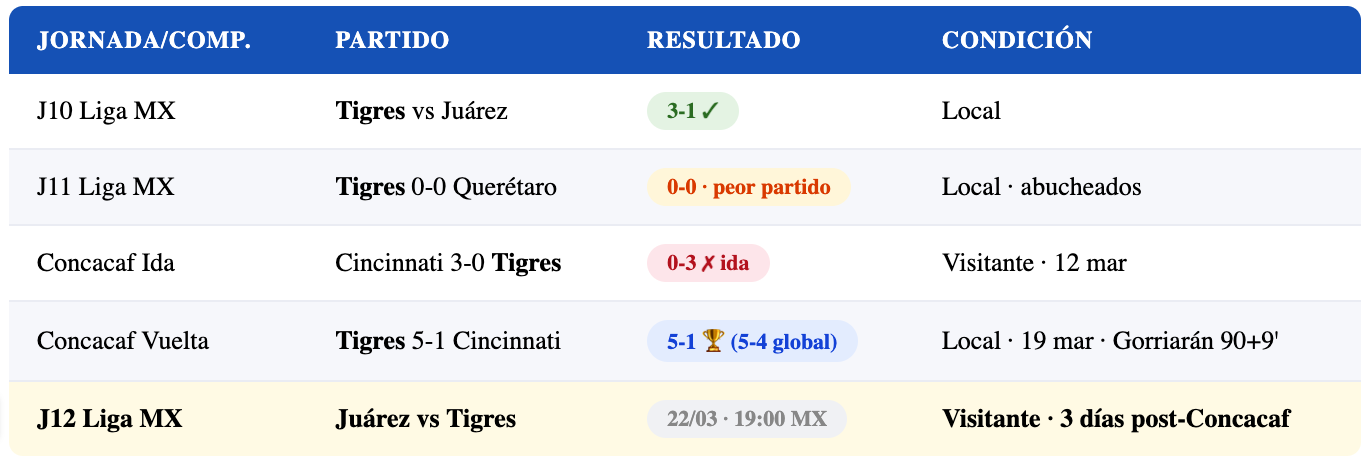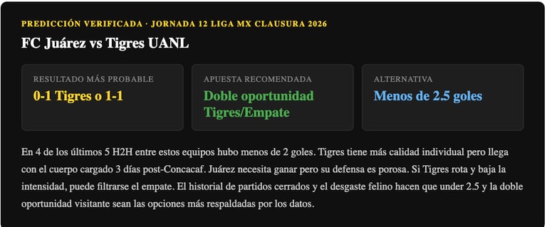 El desgaste post-Concacaf de Tigres es el factor más impredecible. Si el técnico rota y baja la intensidad, Juárez puede sacar algo. Si Tigres sale con todo, la brecha de calidad entre ambos planteles es considerable.