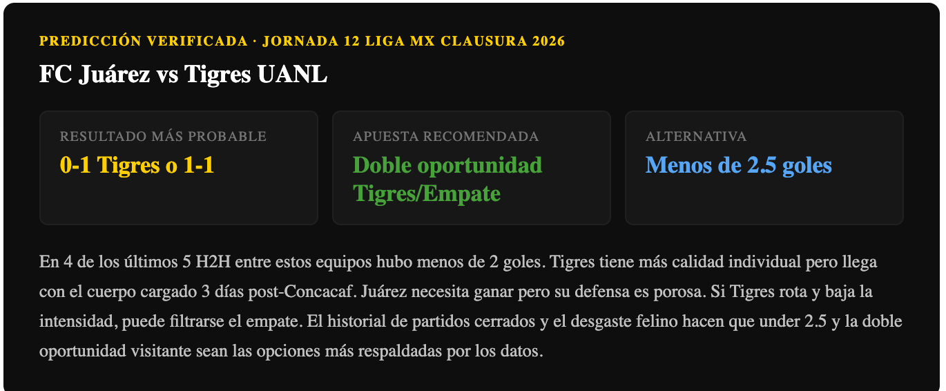 Pronóstico FC Juárez vs Tigres UANL — Jornada 12 Liga MX Clausura 2026