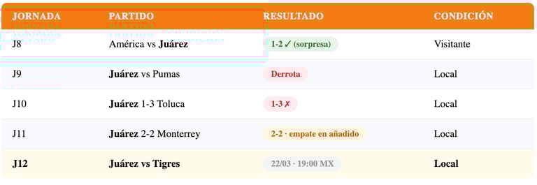 En la Jornada 11, Juárez protagonizó un duelo electrizante con Monterrey que terminó 2-2: iban ganando, pero los Rayados empataron en el tiempo añadido. Antes, en la J10, perdieron 1-3 ante el Toluca en casa. Su registro como local en el Clausura: 2 victorias, 1 empate y 2 derrotas en el Olímpico Benito Juárez. El estadio fronterizo puede ser una fortaleza cuando el equipo está enchufado.