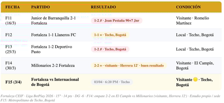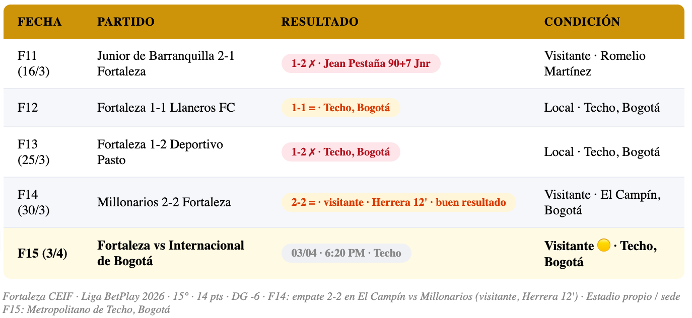 Fortaleza CEIF viene de un resultado que generó respeto en el fútbol colombiano: el empate 2-2 en El Campín ante Millonarios (F14, 30 de marzo). El gol de apertura fue de Juan Sebastián Herrera al minuto 12 como visitante, antes de que Leonardo Castro igualara para el local. Ese resultado — empatar en El Campín de Bogotá — muestra que Fortaleza tiene recursos para competir con los equipos de arriba. Sin embargo, la derrota 1-2 ante Pasto (F13) y la racha inconsistente del torneo mantienen al equipo en la 15ª posición con 14 puntos, fuera del top 8 por un margen que se agranda con cada fecha que pasa.