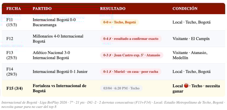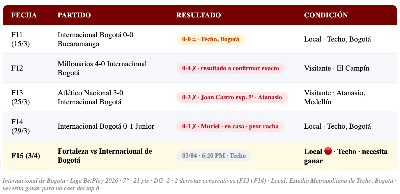 Internacional de Bogotá fue una de las revelaciones del primer tramo del torneo — llegó a liderar la Liga BetPlay en algún momento del Apertura 2026 con 20+ puntos en posición alta — pero las últimas dos fechas frenaron su marcha. La goleada 3-0 de Nacional en el Atanasio (F13) fue un choque de realidad, y la derrota 0-1 ante Junior en el Techo (F14) con gol de Muriel mostró al equipo bogotano vulnerable en su propio estadio. Ahora está 7° con 21 pts y DG negativo (-2) — apenas por encima de la zona de burbuja gracias a las posiciones de otros equipos.