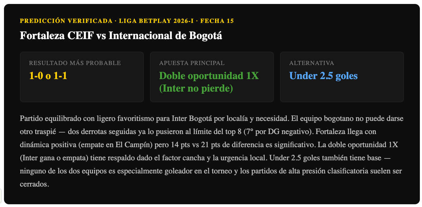 Partido muy equilibrado. Inter tiene la localía y la presión de ganar — dos derrotas seguidas lo hacen vulnerable anímicamente, pero también lo motivan. Fortaleza llega con buena dinámica reciente (empate en El Campín). Ambos necesitan los tres puntos por razones opuestas. La doble oportunidad 1X (Inter no pierde) tiene respaldo dado que juega en casa con necesidad. Under 2.5 goles también tiene base — ambos equipos no son especialmente goleadores en el torneo.
