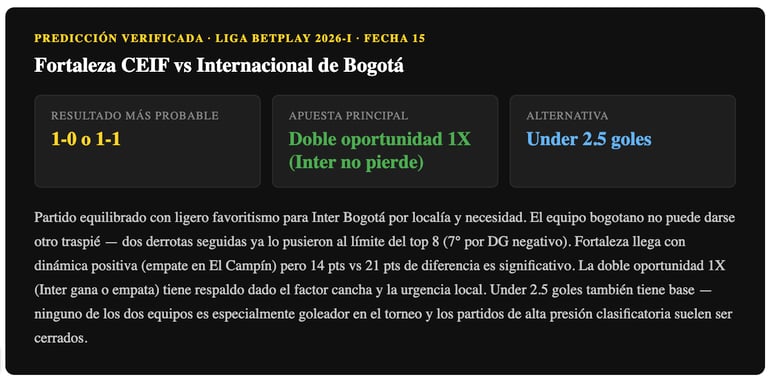 Pronóstico Fortaleza CEIF vs Internacional de Bogotá — Fecha 15 Liga BetPlay 2026