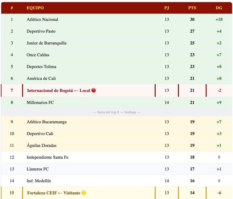 📊 Internacional de Bogotá — F15: 7° · 21 pts · DG -2 · en el top 8 por DG