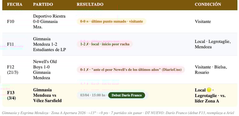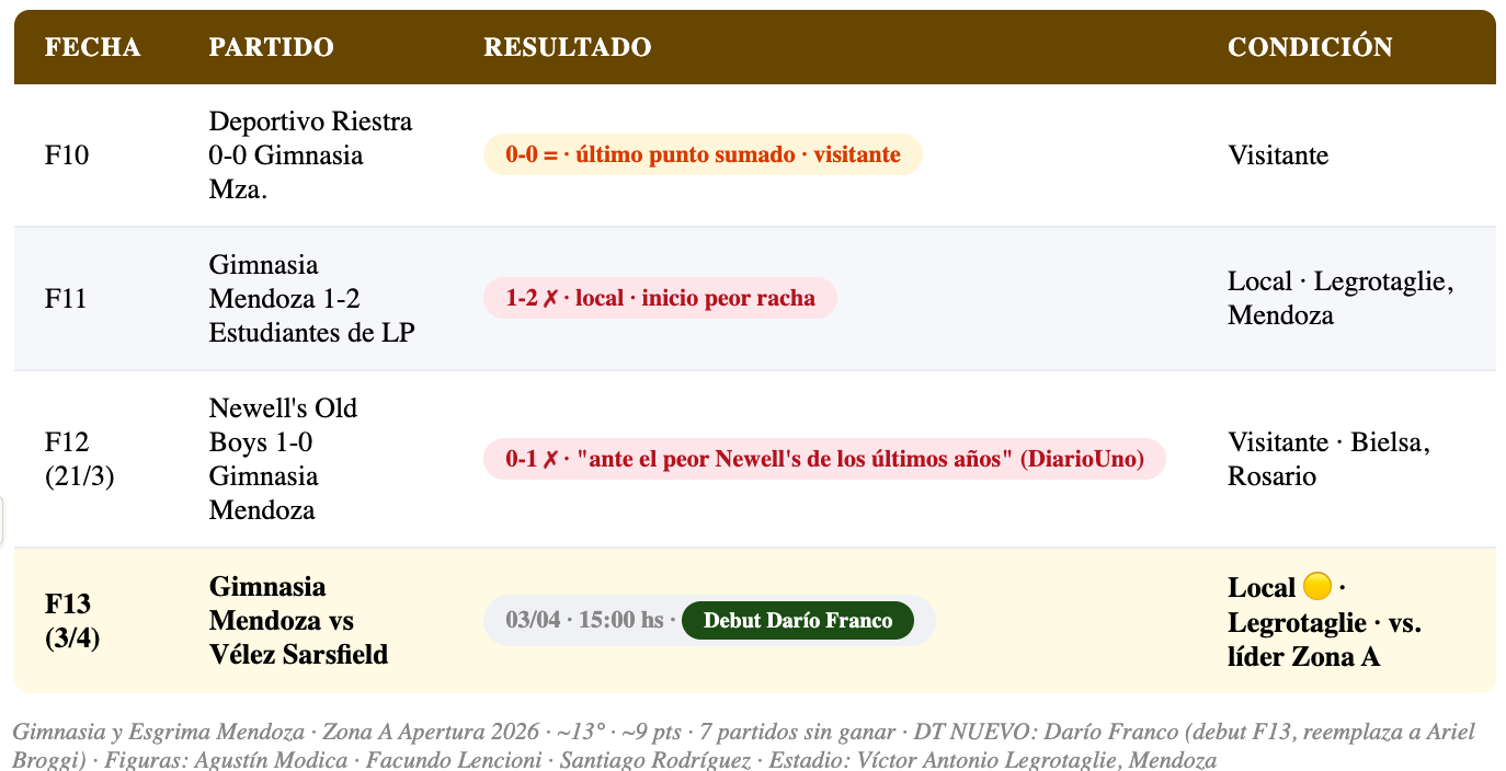 📊 Gimnasia Mendoza — F13: ~13° Zona A · ~9 pts · 7 partidos sin ganar