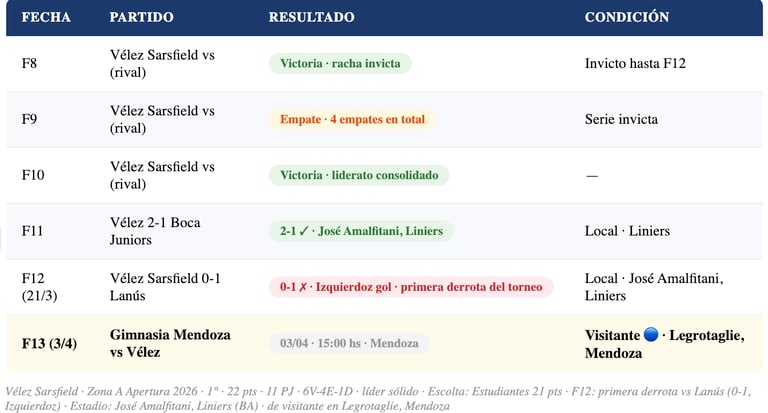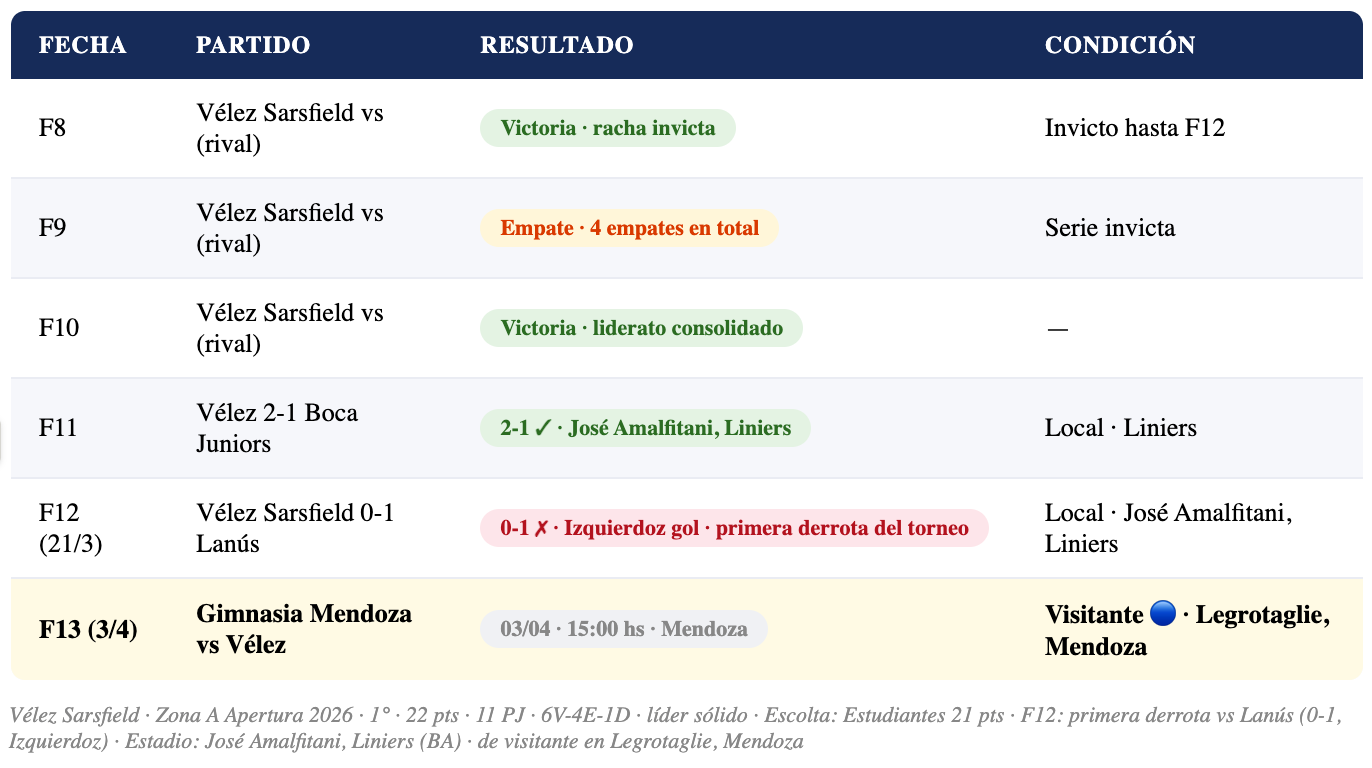 ⚠️ PRIMERA DERROTA DEL TORNEO: La F12 (21 de marzo) fue el primer tropiezo de Vélez: cayó 0-1 ante Lanús de local, con gol del capitán Carlos Izquierdoz para el "Granate". Esa derrota rompió el invicto del "Fortín" y lo bajó un escalón. La visita a Mendoza es la oportunidad de respuesta inmediata.