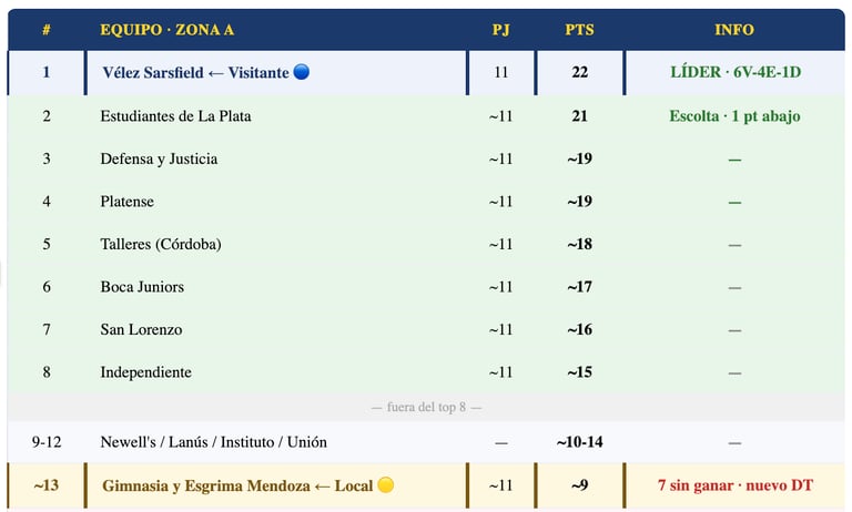 🔝 LÍDER ZONA A CON 22 PTS: Vélez Sarsfield acumula 22 puntos en la Zona A — producto de 6 victorias, 4 empates y 1 sola derrota en 11 fechas (DiarioUno). Es el equipo más sólido de toda la Zona A del Apertura 2026. Un punto debajo aparece Estudiantes de La Plata (21 pts) como escolta, lo que hace que la victoria en Mendoza sea crucial para no perder la punta.