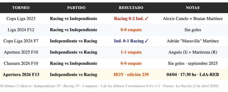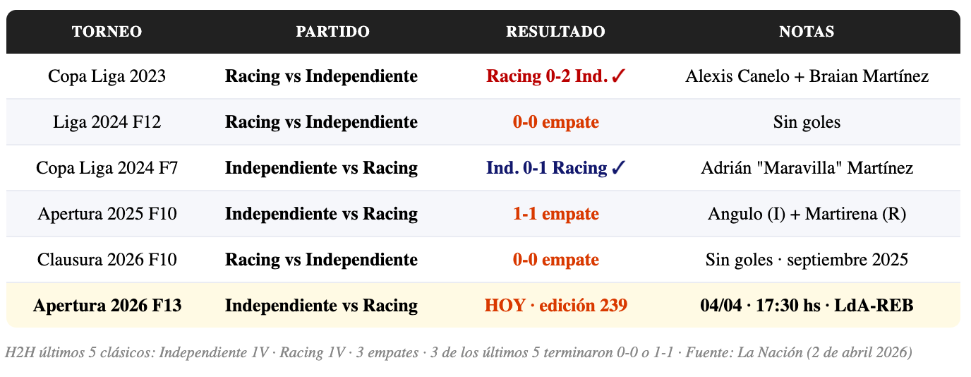 ⚔️ PATRÓN H2H RECIENTE: Clausura 2026 (0-0) · Apertura 2025 (1-1) · Liga 2024 (0-0) · Copa 2024 Racing 1-0 · Copa 2023 Independiente 2-0. Tres de los últimos cinco terminaron sin diferencias de goles — la paridad es la norma en Avellaneda.