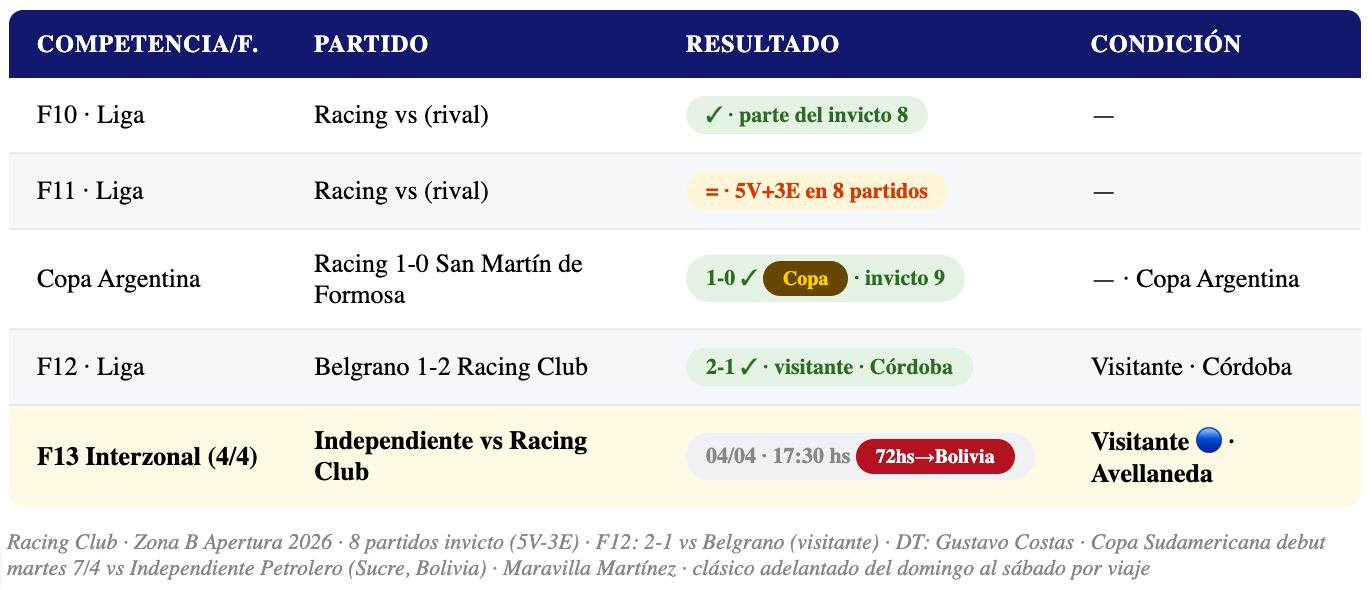 Racing Club de Gustavo Costas llega al clásico en el mejor momento del Apertura 2026 — 8 partidos invicto en Liga (5V + 3E) y victorias en Copa Argentina también. La última victoria fue 2-1 ante Belgrano en Córdoba. El número asciende a 9 si se incluye la Copa. Pero hay una variable que condiciona todo el partido de Racing: apenas 72 horas después del clásico, el equipo deberá viajar a Sucre, Bolivia (altitud extrema ~2.800 msnm) para enfrentar a Independiente Petrolero en el debut de la Copa Sudamericana (martes 7 de abril). El Primer Grande confirma: "la planificación física empezó a tener un peso determinante" — el clásico se adelantó del domingo al sábado precisamente por este motivo.