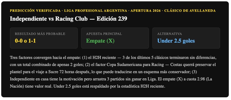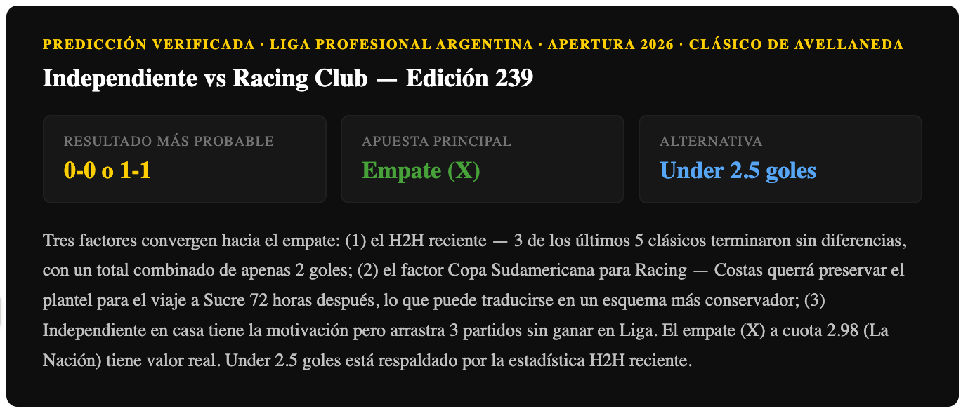 El H2H reciente (3 empates en los últimos 5 clásicos), el factor Bolivia para Racing y la condición local de Independiente apuntan al empate como resultado más probable. La doble oportunidad 1X (Independiente no pierde) también tiene respaldo dado que juega de local en el Libertadores de América lleno. Under 2.5 goles es otra apuesta bien respaldada — los últimos 3 clásicos terminaron con 0 o 2 goles en total.