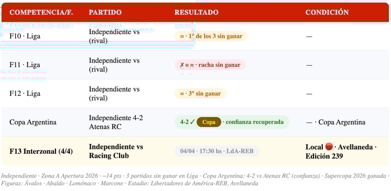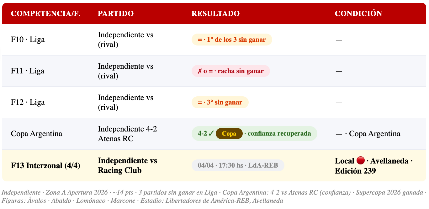 📊 Independiente — F13: Zona A · ~14 pts · fuera del top 8 · 3 partidos sin ganar en Liga