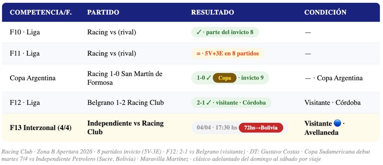 📊 Racing Club — F13: Zona B · 8 partidos invicto (5V-3E) en Liga · Copa Argentina ganada
