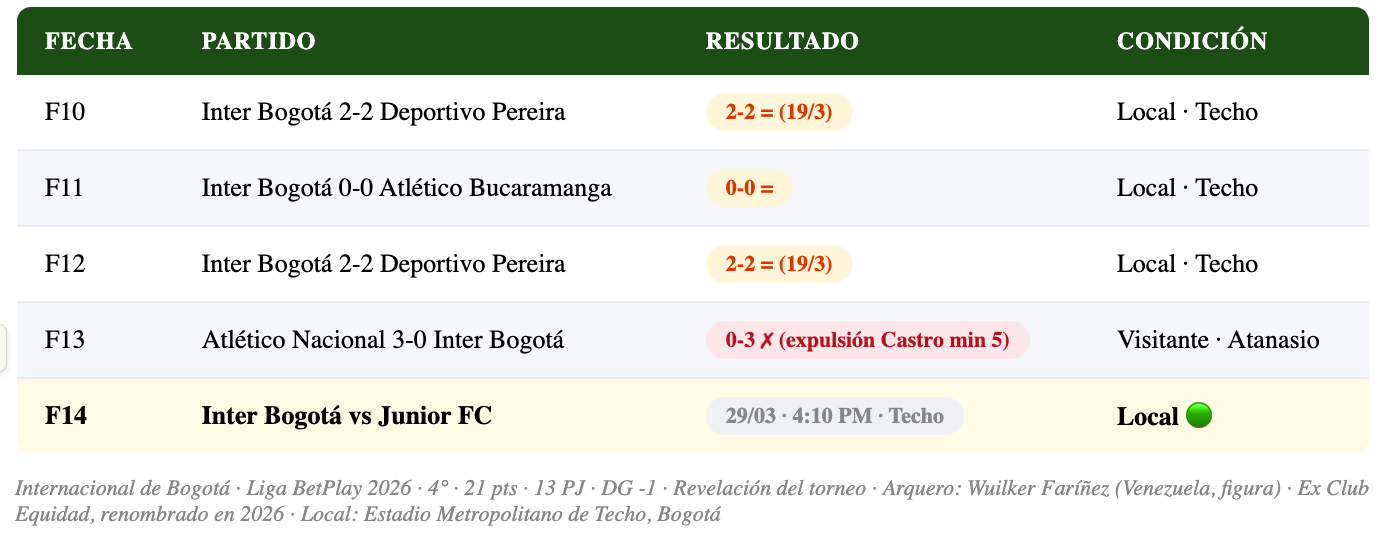 El domingo 29 de marzo, después del amistoso de la Selección Colombia contra Francia, el fútbol de Liga vuelve con uno de los duelos más atractivos de la Fecha 14: Internacional de Bogotá — la revelación del torneo y el ex Equidad renombrado — recibe al campeón defensor Junior FC en el Estadio Metropolitano de Techo. Un choque entre el equipo que sorprendió a la Liga y el que llegó como favorito y no ha podido confirmar su nivel en los últimos partidos.