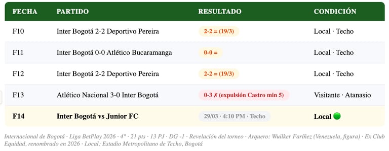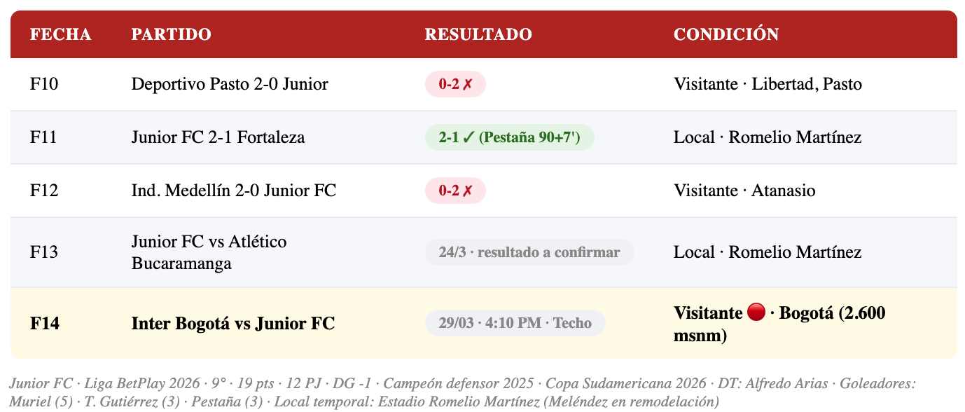Los últimos dos resultados son preocupantes: derrota 2-0 ante Medellín en la F12 (el Atanasio fue un estadio complicado) y el partido pendiente de la F13 ante Bucaramanga (24/3). Llegar a Bogotá como visitante ante un Inter motivado en el Techo, después de esos resultados, es un reto importante para el equipo barranquillero.