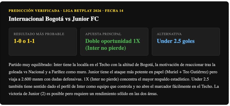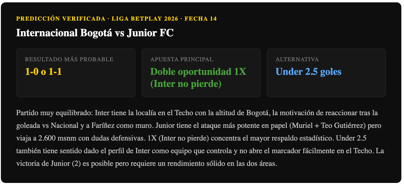 Partido muy equilibrado con Inter teniendo la ventaja de la localía en el Techo y la motivación de reaccionar tras la goleada vs Nacional. Junior llega con dudas defensivas y de visitante a Bogotá. La victoria local (1) o el empate (X) son los resultados más probables. Doble oportunidad 1X (Inter no pierde) es la opción con mayor respaldo dado el factor estadio y altitud. Under 2.5 también tiene sentido — Inter es un equipo que controla los partidos y no suele abrir mucho el marcador en el Techo.