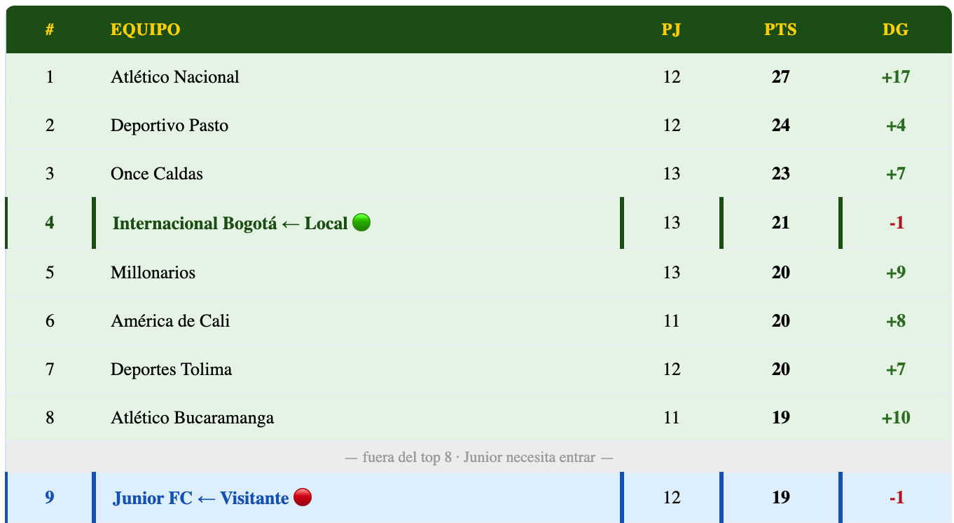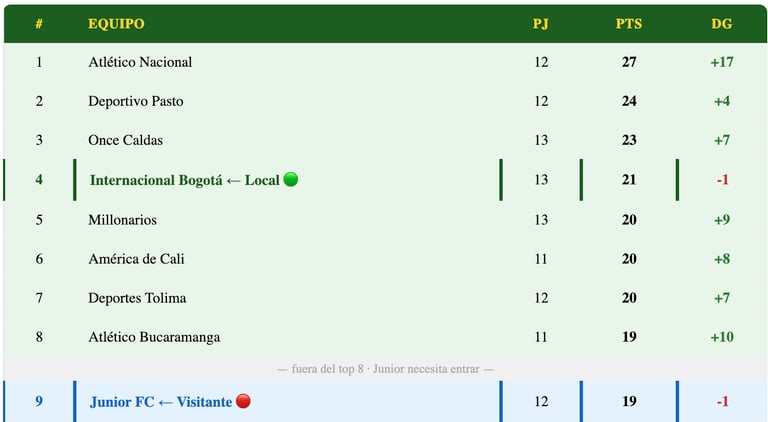 Con Nacional (27 pts) como líder, la pelea de este partido tiene implicaciones directas en el top 4: Inter (4°, 21 pts) puede consolidarse o perder terreno, mientras Junior (9°, 19 pts) necesita ganar para volver al top 8 y no alejarse definitivamente.