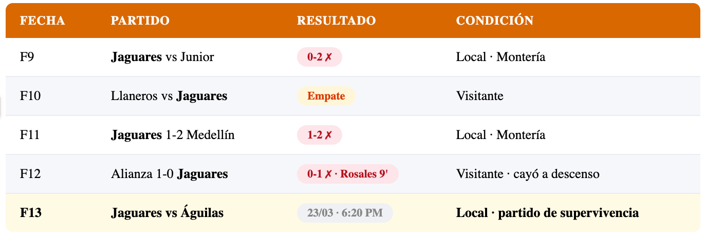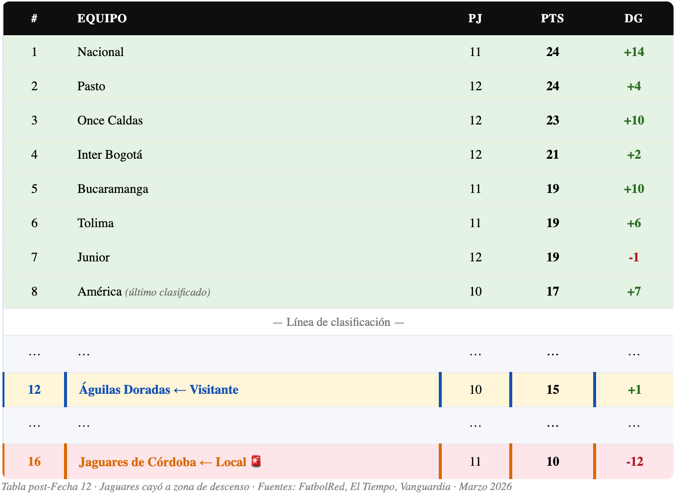 El Estadio Jaraguay de Montería recibe este lunes un partido cargado de urgencia para el equipo local. Jaguares de Córdoba, recién descendido a zona de descenso tras la derrota 0-1 ante Alianza en la Fecha 12, necesita imperiosamente tres puntos para salir de ese peligroso sótano. Enfrente llegan las Águilas Doradas, 12° con 15 puntos, con opciones de meterse entre los ocho primeros pero sin la presión existencial que tiene el equipo cordobés. Un duelo de motivaciones dispares en tierras costeñas.