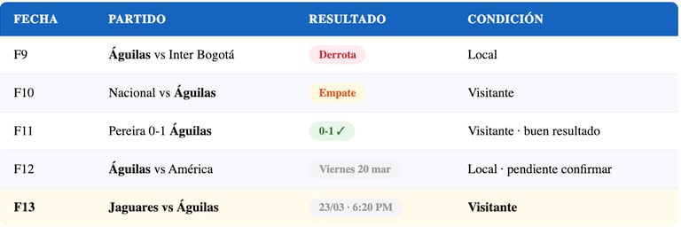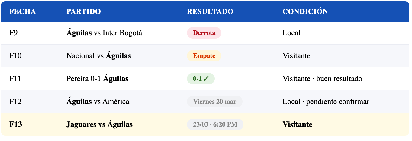 Jaguares necesita ganar para salir de la zona de descenso. Águilas necesita ganar para escalar hacia los clasificados. Los incentivos están claros, pero con realidades muy distintas: para Jaguares es supervivencia, para Águilas es ambición.