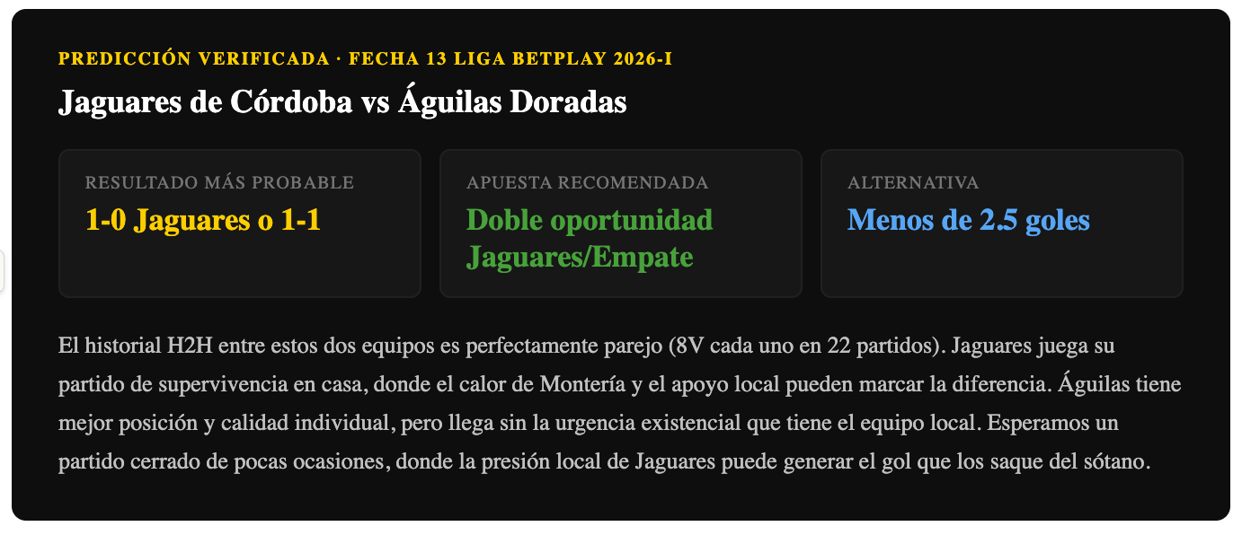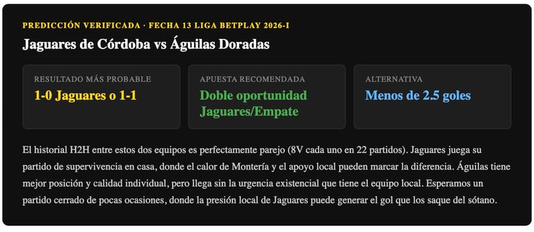 Copy-paste directo: Post title: Pronóstico Jaguares de Córdoba vs Águilas Doradas — Fecha 13 Liga BetPlay 2026 Post description: Jaguares de Córdoba recibe a Águilas Doradas en el Estadio Jaraguay de Montería el lunes 23 de marzo a las 6:20 p.m. Los cordobeses acaban de caer a zona de descenso con 10 puntos. Análisis, historial y predicción verificada.